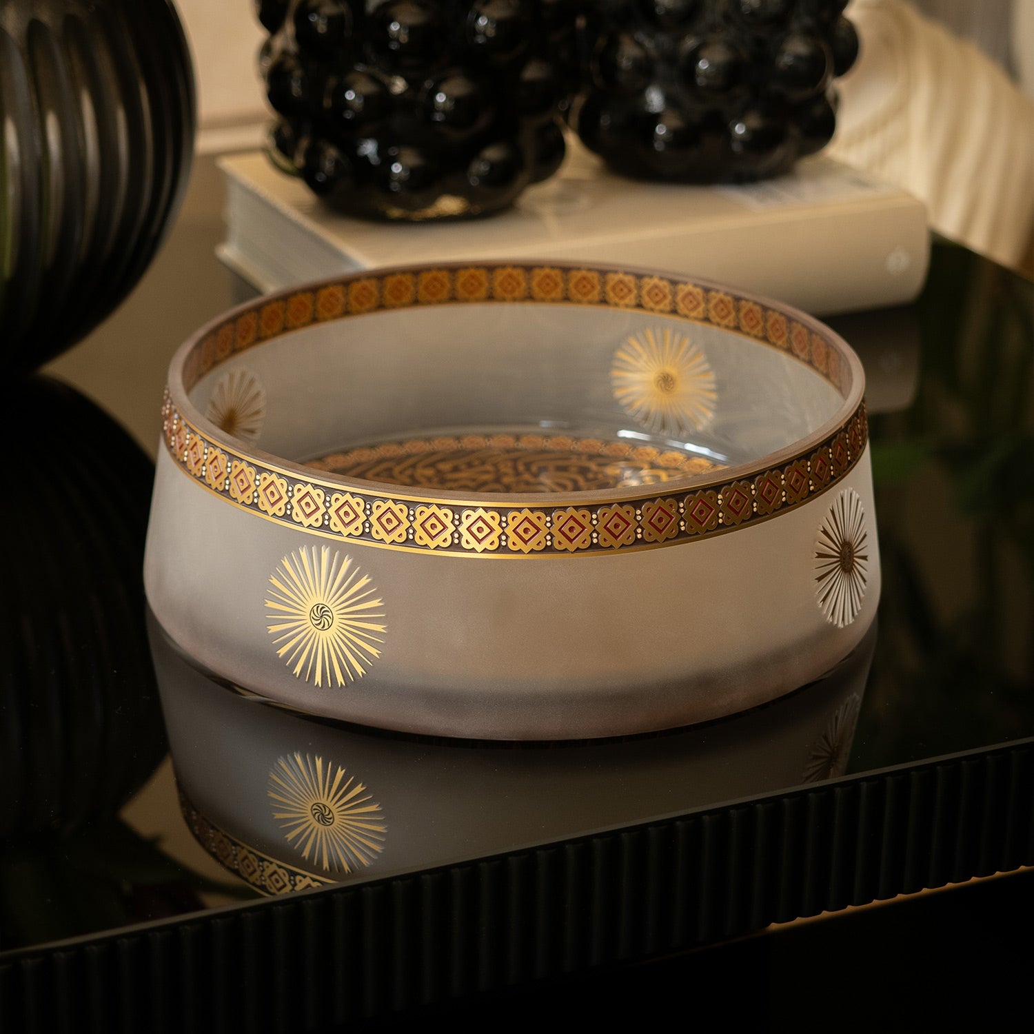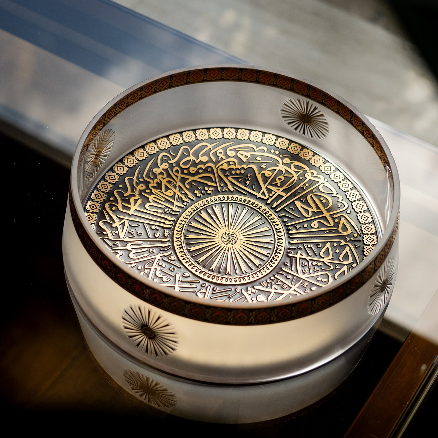İnce desenleri ve iç içe geçmiş geometrik detaylarıyla dikkat çeken bu özel kase, altın varak ve mine işçiliğiyle özenle bezenmiştir.
