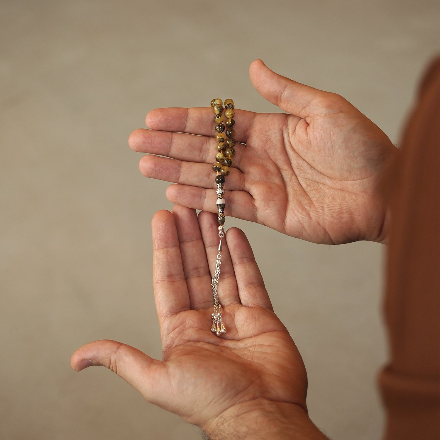 Bu tesbih, adını hem parlak duruşundan hem de içinde barındırdığı doğal fosilli damla kehribar malzemeden alır. Zikri bir ibadet olarak görenler için tasarlanmış, hem ruhu hem de gözü tatmin eden özel bir tesbihtir.