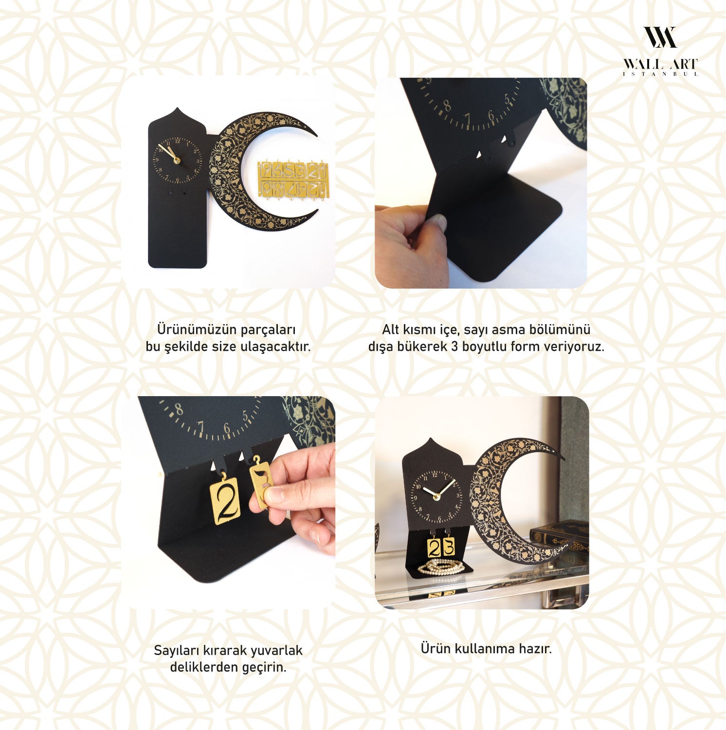 Renkli dijital baskı detaylarıyla zenginleşen tasarım, Ramazan günlerinin ürüne asılarak takip edilmesine olanak tanır. Saat detayı, günün akışını hatırlatırken; takvim bölümü Ramazan’ın ritmini görünür kılar. Ürün düz halde gönderilir ve kullanıcı kendi elleriyle bükerek son formunu verir. Bu küçük dokunuş, ürünle kurulan bağı anlamlı bir ritüele dönüştürür.