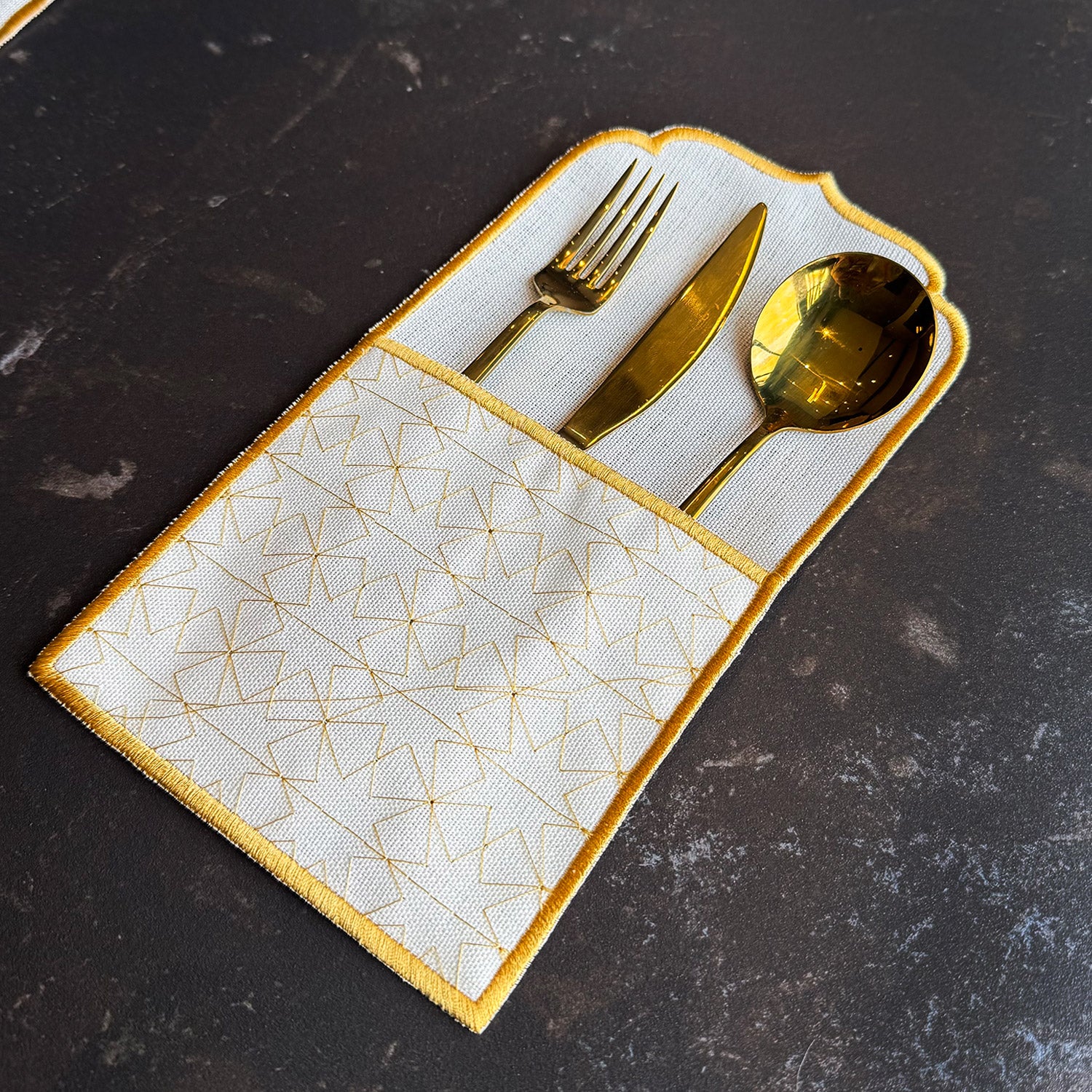 İslami motiflerden ilham alan 3 parçalı kumaş sofra seti; tabak altlığı, peçete ve çatal-kaşıklıktan oluşur.