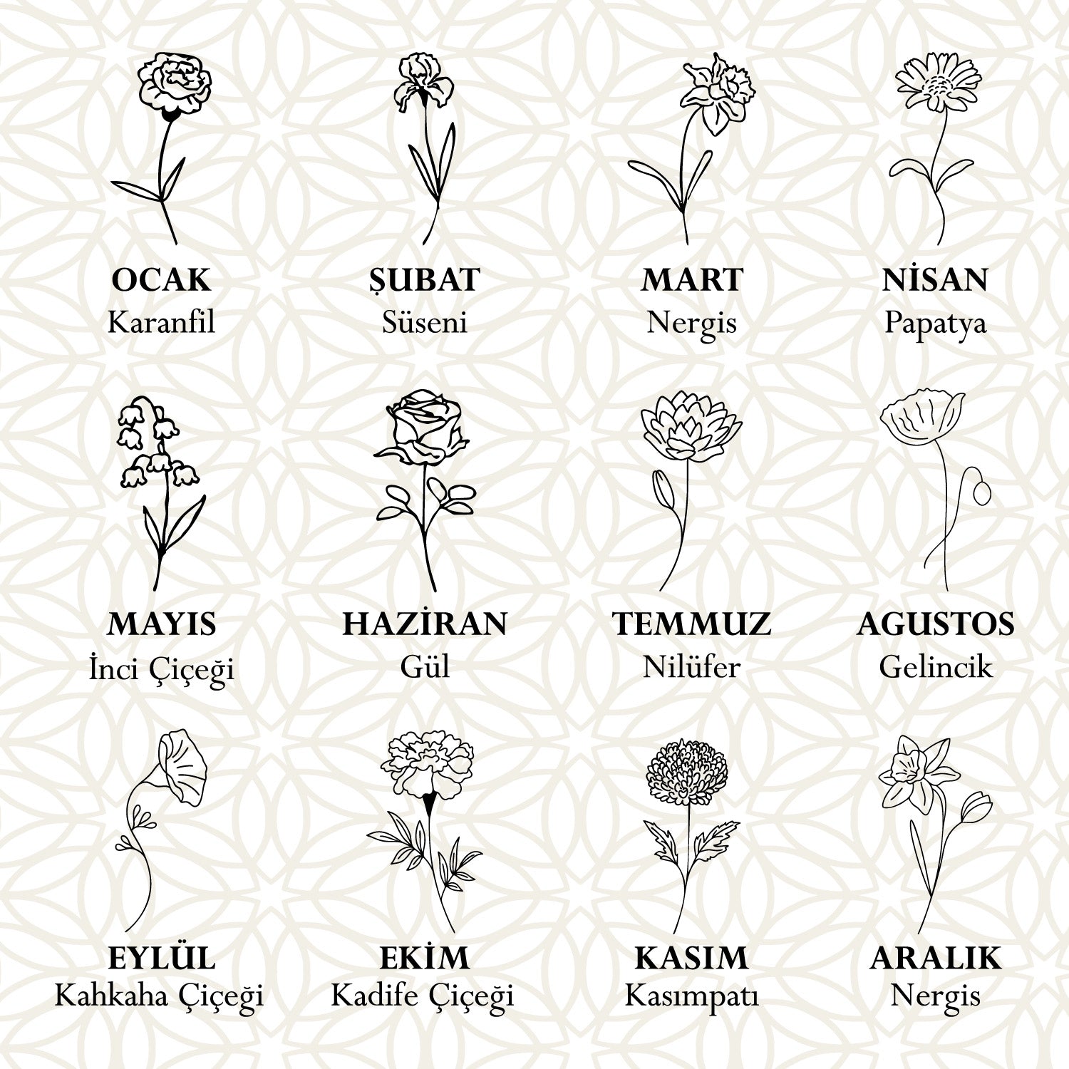 Her bir isim, doğum çiçeğiyle birleşerek sevgi, zarafet ve yaşamın döngüsünü simgeler.